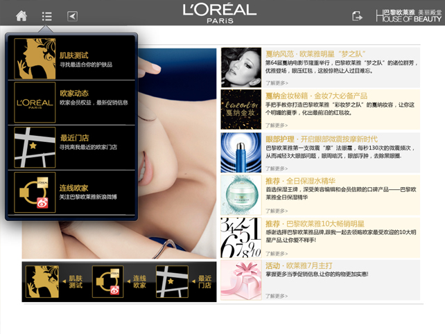 巴黎歐萊雅美麗殿堂應用程序運用最新的Social network ,LBS, shake等功能讓你擁有24小時美容顧問,盡享美容TIPS。