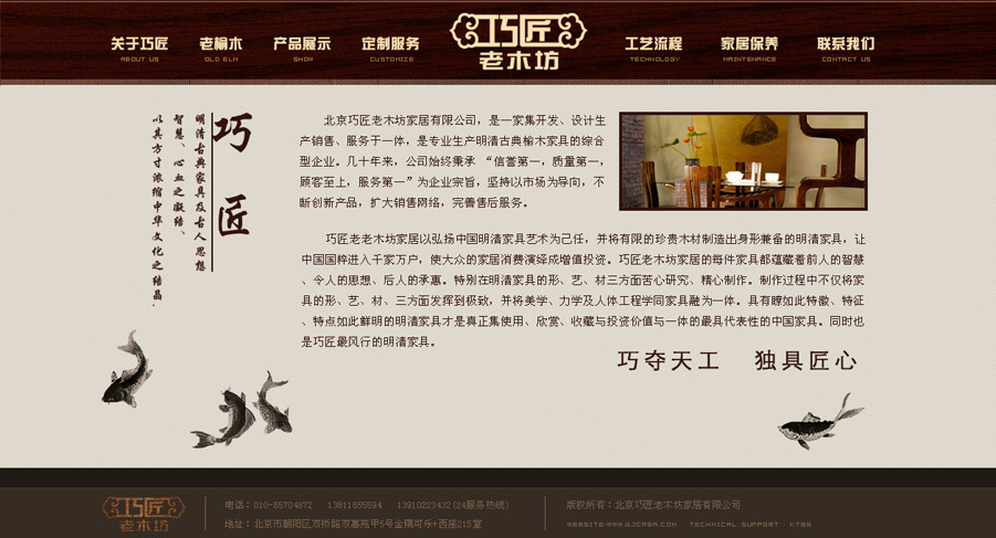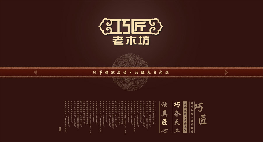 網站設計為一屏顯示,為了讓觀眾更多的關注產品。突出明式家具的簡潔、流暢的特點,配色上表現出中式深沉、內斂的效果,細節之處把原有中式元素再加以簡練,重點營造出中式氣氛。