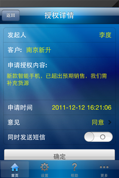 用戶通過App提交授權信息,能及時傳達到上層領導手機終端,同時也能收到相關授權申請的回復確認。