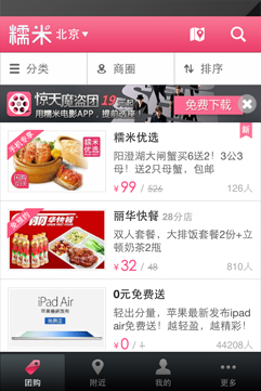 糯米網(nuomi.com)是中國最早、口碑最好的團購網站,這里有你意想不到的精品團購、無法拒絕的勁爆折扣。美食、電影、娛樂、生活、酒店、旅游等給力團購一應俱全!低至1折!不過癮?還有限時秒殺單、每日限量閃購、手機專享單等更多神秘驚喜等著你!糯米網是國內唯一上市的團購網站,創新提供隨時退款、過期退款、先行賠付等金牌服務體系,以及行業唯一的閃電物流配送系統。團購只上糯米網,吃喝玩樂一網打盡!