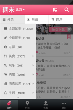 查找:地圖/列表雙重模式,搜羅身邊美食、電影、酒店、KTV等團購; 篩選:分類+商圈組合篩選,支持價格、距離、銷量等多種排序方式; 特權:暢享手機專享團購、限量閃購和限時秒殺多種特權服務; 購買:隨時隨地想買就買,糯米券隨身攜帶隨時都能消費; 導航:快速獲取商家目的地交通路線,跟著地圖走不怕找不著; 安全:支付寶、信用卡、儲蓄卡多種支付方式安全便捷。